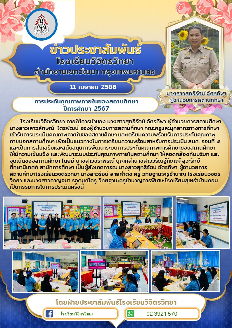โรงเรียนวิจิตรวิทยา ภายใต้การนำของ นางสาวสุทธิรัตน์ ฉัตรทิพา ผู้อำนวยการสถานศึกษา นางสาวเสาวลักษณ์ ไตรพัฒน์ รองผู้อำนวยการสถานศึกษา คณะครูและบุคลากรทางการศึกษา เข้ารับการประเมินคุณภาพภายในของสถานศึกษา และเตรียมความพร้อมรับการประกันคุณภาพภายนอกสถานศึกษา เพื่อเป็นแนวทางในการเตรียมความพร้อมสำหรับการประเมิน สมศ. รอบที่ ๕ และเป็นการส่งเสริมและสนับสนุนการพัฒนาระบบการประกันคุณภาพการศึกษาของสถานศึกษา ให้มีความเข้มแข็ง และพัฒนาระบบประกันคุณภาพภายในสถานศึกษา ให้สอดคล้องกับบริบท และจุดเน้นของสถานศึกษา โดยมี นางสาวจิราพรณ์ บุญกล่ำนางสาววรัณฐ์กัญญ์ สุวะรักษ์ ศึกษานิเทศก์ สำนักการศึกษา เป็นผู้สังเกตการณ์ นางสาวสุทธิรัตน์ ฉัตรทิพา ผู้อำนวยการสถานศึกษาโรงเรียนวิจิตรวิทยา นางสาวรัชนี สายคำติ่ง ครู วิทยฐานะครูชำนาญ โรงเรียนวิจิตรวิทยา และนางสาวกาญจนา รอดมณีครู วิทยฐานะครูชำนาญการพิเศษ โรงเรียนสุเหร่าบ้านดอนเป็นกรรมการในการประเมินครั้งนี้