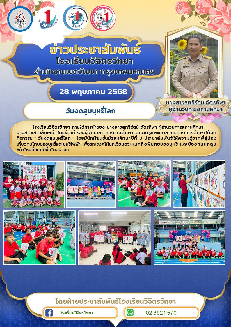 นางสาวเสาวลักษณ์ ไตรพัฒน์ รองผู้อำนวยการสถานศึกษา คณะครูและบุคลากรทางการศึกษาได้จัดกิจกรรม “ วันงดสูบบุหรี่โลก “ โดยมีนักเรียนชั้นมัธยมศึกษาปีที่ 3 ประชาสัมพันธ์ให้ความรู้จากพี่สู่น้องเกี่ยวกับโทษของบุหรี่และบุหรี่ไฟฟ้า เพื่อรณรงค์ให้นักเรียนตระหนักถึงพิษภัยของบุหรี่ และป้องกันนักสูบหน้าใหม่ที่จะเกิดขึ้นในอนาคต