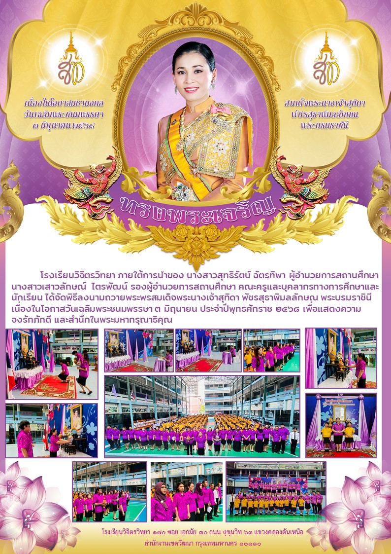 โรงเรียนวิจิตรวิทยา ภายใต้การนำของ นางสาวสุทธิรัตน์ ฉัตรทิพา ผู้อำนวยการสถานศึกษา นางสาวเสาวลักษณ์ ไตรพัฒน์ รองผู้อำนวยการสถานศึกษา คณะครูและบุคลากรทางการศึกษาและนักเรียน ได้จัดพิธีลงนามถวายพระพรสมเด็จพระนางเจ้าสุทิดา พัชรสุธาพิมลลักษณ พระบรมราชินี เนื่องในโอกาสวันเฉลิมพระชนมพรรษา ๓ มิถุนายน ประจำปีพุทธศักราช ๒๕๖๘ เพื่อแสดงความจงรักภักดี และสำนึกในพระมหากรุณาธิคุณ