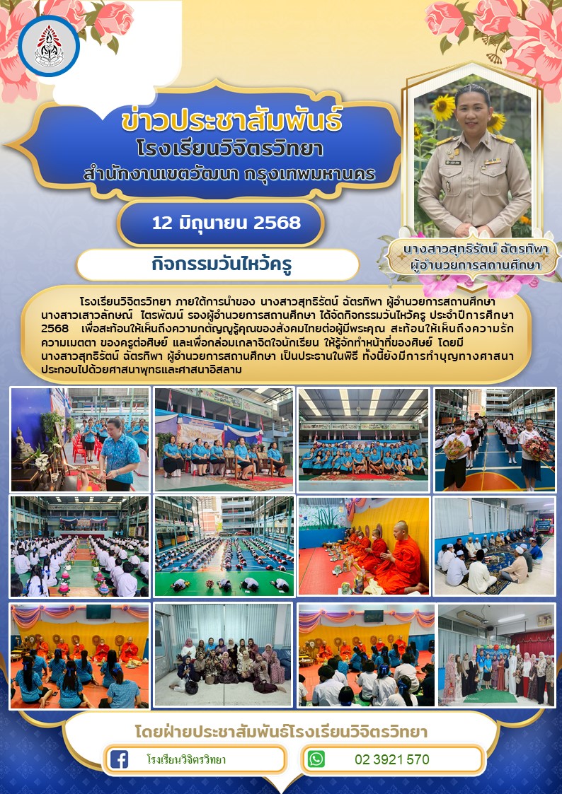 นางสาวเสาวลักษณ์ ไตรพัฒน์ รองผู้อำนวยการสถานศึกษา ได้จัดกิจกรรมวันไหว้ครู ประจำปีการศึกษา 2568 เพื่อสะท้อนให้เห็นถึงความกตัญญูรู้คุณของสังคมไทยต่อผู้มีพระคุณ สะท้อนให้เห็นถึงความรัก ความเมตตา ของครูต่อศิษย์ และเพื่อกล่อมเกลาจิตใจนักเรียน ให้รู้จักทำหน้าที่ของศิษย์ โดยมี