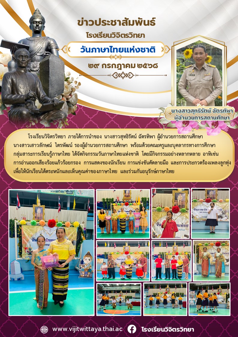 โรงเรียนวิจิตรวิทยา ภายใต้การนำของ นางสาวสุทธิรัตน์ ฉัตรทิพา ผู้อำนวยการสถานศึกษานางสาวเสาวลักษณ์ ไตรพัฒน์ รองผู้อำนวยการสถานศึกษา พร้อมด้วยคณะครูและบุคลากรทางการศึกษากลุ่มสาระการเรียนรู้ภาษาไทย ได้จัดกิจกรรมวันภาษาไทยแห่งชาติ โดยมีกิจกรรมอย่างหลากหลาย อาทิเช่นการอ่านออกเสียงร้อยแก้วร้อยกรอง การแสดงของนักเรียน การแข่งขันคัดลายมือ และการประกวดร้องเพลงลูกทุ่ง เพื่อให้นักเรียนได้ตระหนักและเห็นคุณค่าของภาษาไทย และร่วมกันอนุรักษ์ภาษาไทย