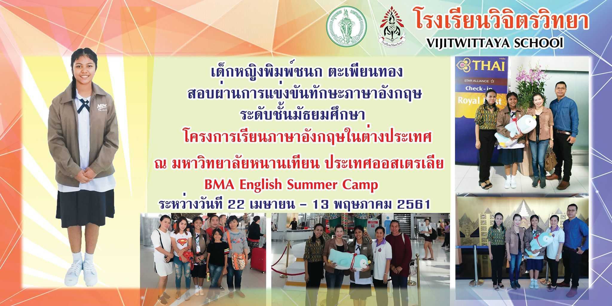 ขอแสดงความยินดีกับ เด็กหญิงพิมพ์ชนก ตะเพียนทอง สอบผ่านการแข่งขันทักษะภาษาอังกฤษ โครงการเรียนภาษาอังกฤษในต่างประเทศ ณ มหาวิทยาลัยหนานเทียน ประเทศออสเตรเลีย